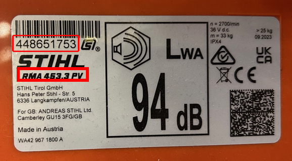 Le nom exact du produit est situé soit à coté , soit sous le nom de la marque "STIHL".